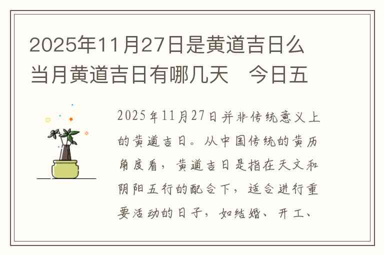 2025年11月27日并非传统意义上的黄道吉日。从中国传统的黄历角度看,黄道吉日是指在天文和阴阳五行的配合下,适合进行重要活动的日子,如结婚、开工、安床等。然而,黄历并不仅仅基于某一天的日期来确定,还涉及天干地支的配合、五行的生克关系等多重因素。根据查询,2025年11月27日并未列为黄道吉日。