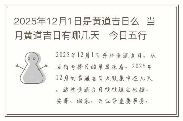 2025年12月1日并非黄道吉日。从五行与择日的角度来看,2025年12月的黄道吉日大致集中在几天。这些黄道吉日往往适合结婚、安葬、搬家、开业等重要事务,它们与天干地支的相生相克以及阴阳五行的配合密切相关。我们可以根据这些日子来选择更为合适的时间来进行活动。