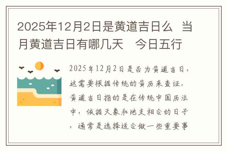 2025年12月2日是否为黄道吉日,这需要根据传统的黄历来查证。黄道吉日指的是在传统中国历法中,依据天象和地支相合的日子,通常是选择适合做一些重要事情的日子,如结婚、开工、搬家等。而对于2025年12月2日这一天,是否为黄道吉日,依据具体的黄历数据来判断。由于黄历依据的是天干地支与五行的相生相克等因素,这一天在黄历中的吉凶标示会综合考虑多个因素。