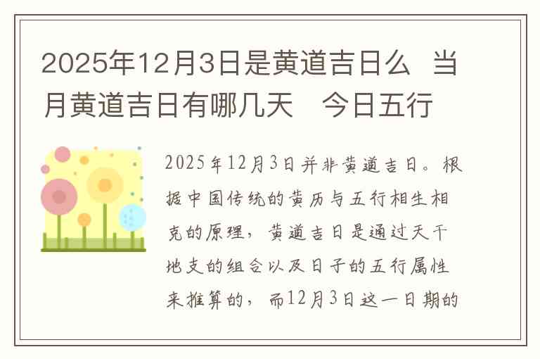 2025年12月3日并非黄道吉日。根据中国传统的黄历与五行相生相克的原理,黄道吉日是通过天干地支的组合以及日子的五行属性来推算的,而12月3日这一日期的天干地支组合不符合黄道吉日的标准。因此,这一天并不适宜进行大事或重要活动。