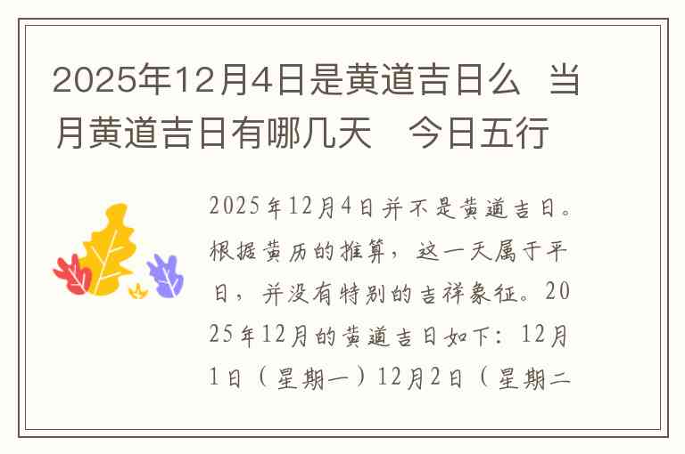 2025年12月4日并不是黄道吉日。根据黄历的推算,这一天属于平日,并没有特别的吉祥象征。