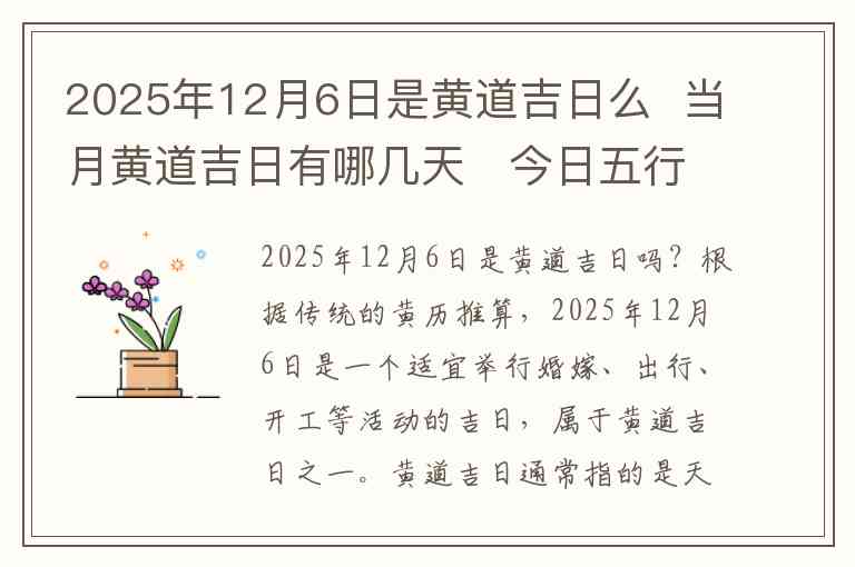2025年12月6日是黄道吉日吗?根据传统的黄历推算,2025年12月6日是一个适宜举行婚嫁、出行、开工等活动的吉日,属于黄道吉日之一。黄道吉日通常指的是天文、地理等因素符合宜进行某些活动的日子,如结婚、搬家、开业等吉祥日子。