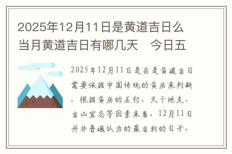 2025年12月11日是否是黄道吉日需要依据中国传统的黄历来判断。根据黄历的五行、天干地支、吉凶宜忌等因素来看,12月11日并非普遍认为的最吉利的日子,而是属于“平日”,即日常宜忌并没有特别明显的标志,所以不算“黄道吉日”。但是,也可以根据个人需要和风水调节,选择进行一些特定活动。