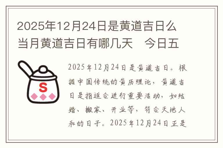 2025年12月24日是黄道吉日。根据中国传统的黄历理论,黄道吉日是指适合进行重要活动,如结婚、搬家、开业等,符合天地人和的日子。2025年12月24日正是一个黄道吉日,适合进行大多数吉利的事情。