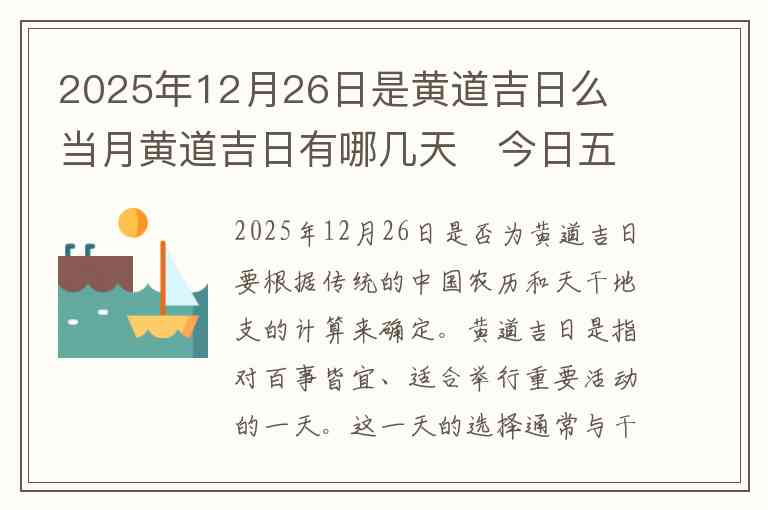 2025年12月26日是否为黄道吉日要根据传统的中国农历和天干地支的计算来确定。黄道吉日是指对百事皆宜、适合举行重要活动的一天。这一天的选择通常与干支、五行、冲煞等因素相关。在中国传统文化中,黄道吉日通常适合结婚、搬家、开业等大事。