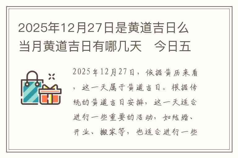 2025年12月27日,依据黄历来看,这一天属于黄道吉日。根据传统的黄道吉日安排,这一天适合进行一些重要的活动,如结婚、开业、搬家等,也适合进行一些有益的事情。因此,如果有特别的计划或事情安排,可以考虑选择这一天。