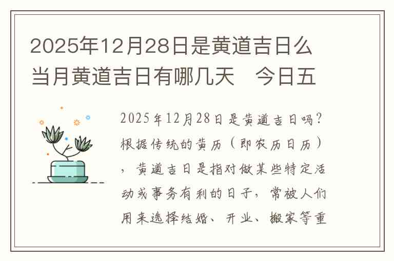 具体到2025年12月28日,这一天是农历十一月二十六。根据一些流传下来的黄历记载,这一天并没有特别被标记为黄道吉日,而是属于普通的日子。对于是否为黄道吉日,还需要结合具体的个人八字或特定事务来分析,因此不能一概而论。总的来说,这一天可能适合做一些不特别敏感或不需要依赖黄道吉日的事情。