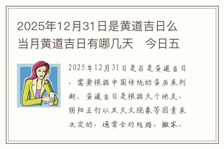 2025年12月31日是否是黄道吉日,需要根据中国传统的黄历来判断。黄道吉日是根据天干地支、阴阳五行以及天文现象等因素来决定的,通常会对结婚、搬家、开业等活动有参考作用。通过查阅2025年12月31日的黄历,可以得知这一天是否是适宜进行重要活动的黄道吉日。