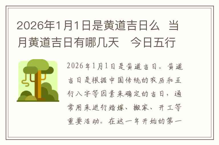 2026年1月1日是黄道吉日。黄道吉日是根据中国传统的农历和五行八字等因素来确定的吉日,通常用来进行婚嫁、搬家、开工等重要活动。在这一年开始的第一天,正是一个适合开展重要事务的好日子。
