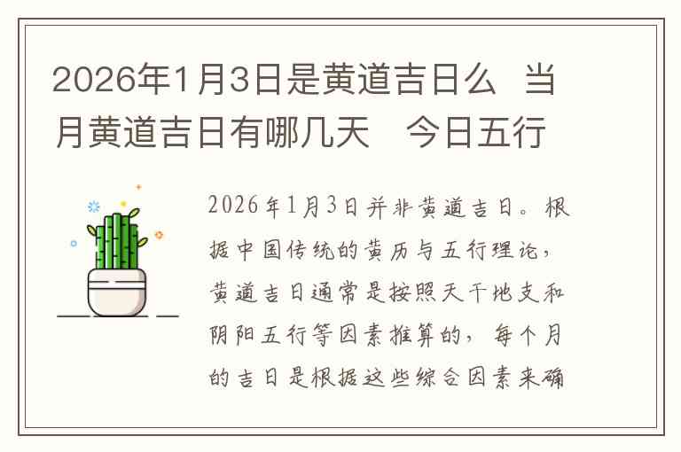2026年1月3日并非黄道吉日。根据中国传统的黄历与五行理论,黄道吉日通常是按照天干地支和阴阳五行等因素推算的,每个月的吉日是根据这些综合因素来确定的,而黄道吉日常常被认为适宜进行一些重要活动,如结婚、开工、搬家等。