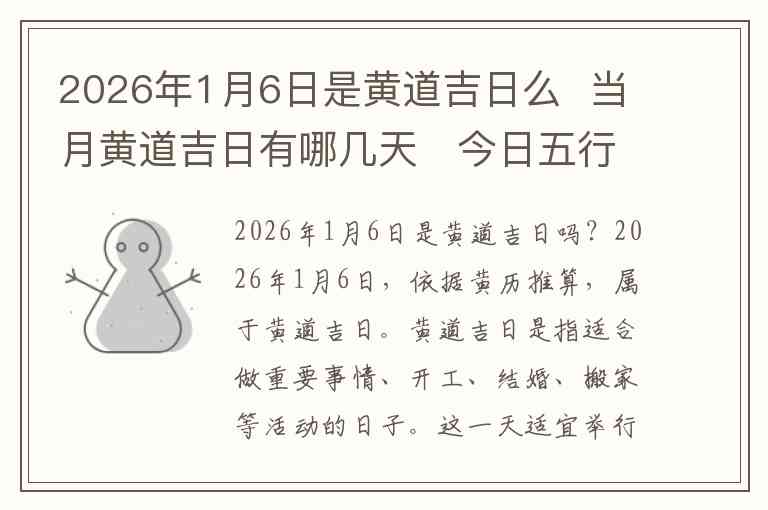 2026年1月6日,依据黄历推算,属于黄道吉日。黄道吉日是指适合做重要事情、开工、结婚、搬家等活动的日子。这一天适宜举行婚庆、搬迁、开业等活动,因为当天的日子被认为天时地利人和,做事容易顺利。