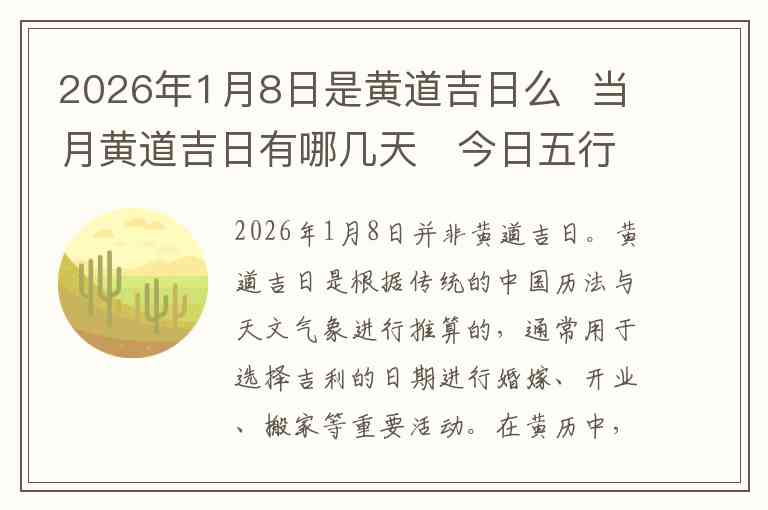 2026年1月8日并非黄道吉日。黄道吉日是根据传统的中国历法与天文气象进行推算的,通常用于选择吉利的日期进行婚嫁、开业、搬家等重要活动。在黄历中,每个月都会有几天被认为是黄道吉日,而这些日期常常受到天干地支、五行、八字等因素的影响。