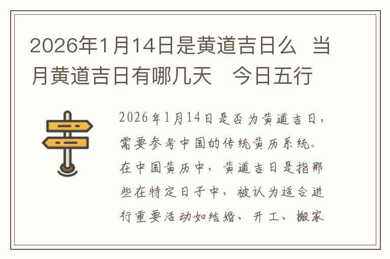 2026年1月14日是否为黄道吉日,需要参考中国的传统黄历系统。在中国黄历中,黄道吉日是指那些在特定日子中,被认为适合进行重要活动如结婚、开工、搬家等的日子。2026年1月14日根据黄历并不完全为黄道吉日,它的宜忌事项显示该日并不被特别推荐为做大事的时机,具体的黄道吉日需要根据详细的年份和日历计算来确定。