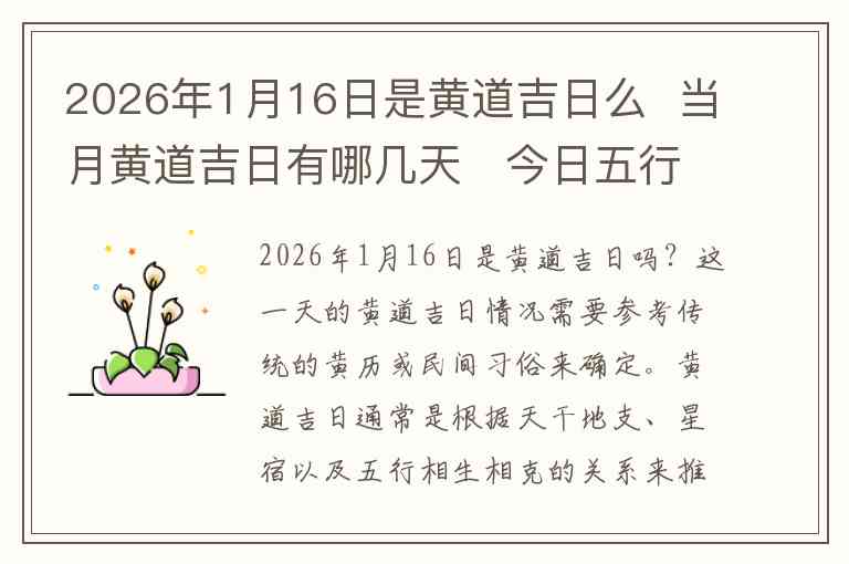 2026年1月16日是黄道吉日吗?这一天的黄道吉日情况需要参考传统的黄历或民间习俗来确定。黄道吉日通常是根据天干地支、星宿以及五行相生相克的关系来推算的。2026年1月16日是农历十二月初五,从这一日期来看,这一天并非特别标示为黄道吉日,但是如果具体需要进行某些重要的活动(如结婚、开业、搬家等),依然可以参考黄历中的吉日推荐,选择更适合的日子。