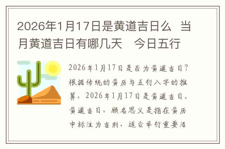 根据传统的黄历与五行八字的推算,2026年1月17日是黄道吉日。黄道吉日,顾名思义是指在黄历中标注为吉利、适合举行重要活动的日子,比如结婚、开业、搬家、祭祀等。因此,2026年1月17日是一个适合进行这些活动的日子。