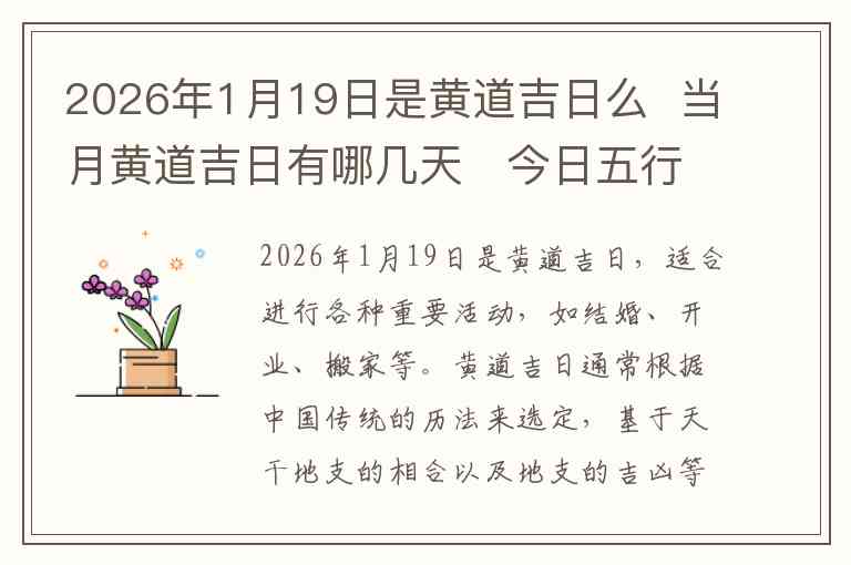2026年1月19日是黄道吉日,适合进行各种重要活动,如结婚、开业、搬家等。黄道吉日通常根据中国传统的历法来选定,基于天干地支的相合以及地支的吉凶等因素,因此每月都有不同的吉日。
