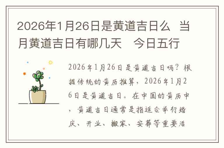 2026年1月26日是黄道吉日吗?根据传统的黄历推算,2026年1月26日是黄道吉日。在中国的黄历中,黄道吉日通常是指适合举行婚庆、开业、搬家、安葬等重要活动的日子。黄道吉日的选择基于阴阳五行、天干地支的配合,通常是以“日柱”的天干地支与当天的其他元素协调来判断的。