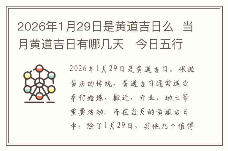 2026年1月29日是黄道吉日。根据黄历的传统,黄道吉日通常适合举行婚嫁、搬迁、开业、动土等重要活动。而在当月的黄道吉日中,除了1月29日,其他几个值得注意的吉日包括1月2日、1月5日、1月9日、1月13日和1月17日。这些日子都是适合做一些需要顺利成行的事情的好日子。