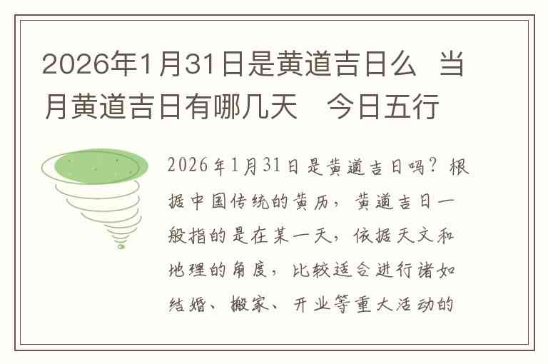 2026年1月31日是黄道吉日吗?根据中国传统的黄历,黄道吉日一般指的是在某一天,依据天文和地理的角度,比较适合进行诸如结婚、搬家、开业等重大活动的日子。黄历会根据天干地支、五行、阴阳等因素来推算吉日。