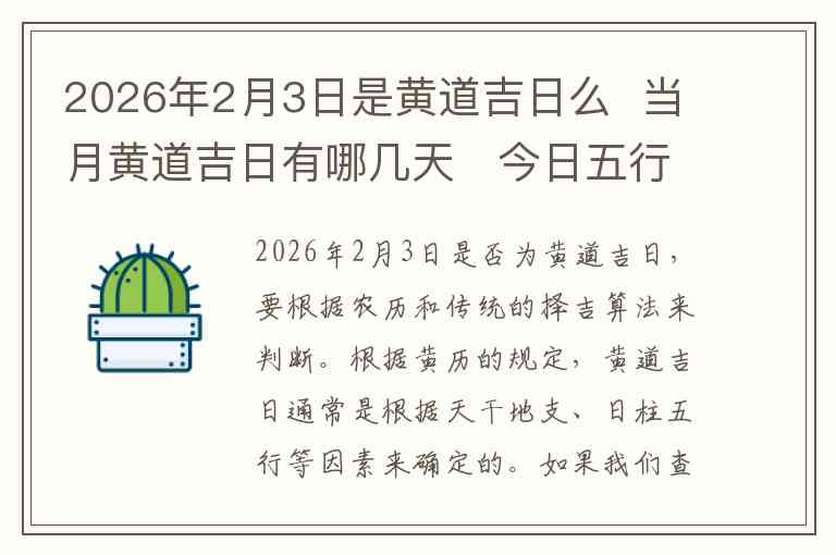 2026年2月3日是否为黄道吉日,要根据农历和传统的择吉算法来判断。根据黄历的规定,黄道吉日通常是根据天干地支、日柱五行等因素来确定的。如果我们查阅2026年2月的黄历,2月3日为农历腊月二十九,日柱为辛酉,辛为金,酉为金,这一天的五行属金。对于一些需要“金”属性的活动,如金属相关的事务,这一天是较为适宜的;但若是需要避开金的活动,可能不太理想。