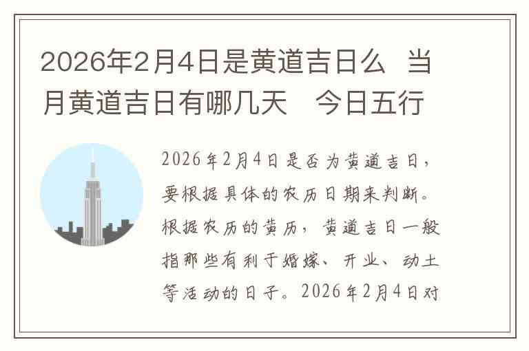 2026年2月4日是否为黄道吉日,要根据具体的农历日期来判断。根据农历的黄历,黄道吉日一般指那些有利于婚嫁、开业、动土等活动的日子。2026年2月4日对应的是农历腊月二十六,农历腊月的黄道吉日较少,这一天并不被认为是黄道吉日。