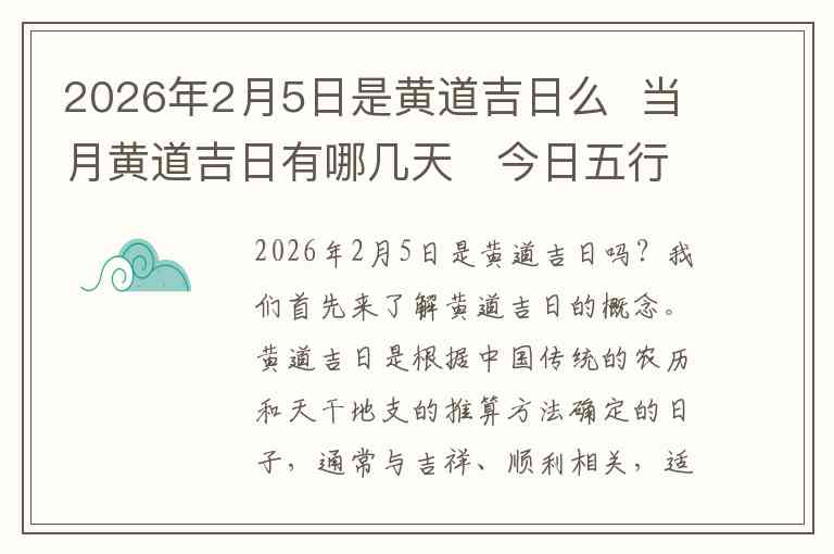 2026年2月5日是黄道吉日吗?我们首先来了解黄道吉日的概念。黄道吉日是根据中国传统的农历和天干地支的推算方法确定的日子,通常与吉祥、顺利相关,适合举行婚礼、搬家、开业等重大活动。黄道吉日的选择依据了中国古代的历法,参考了五行、八字、星宿等因素来判断。