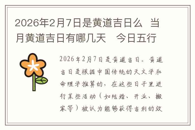 2026年2月7日是黄道吉日。黄道吉日是根据中国传统的天文学和命理学推算的,在这些日子里进行某些活动(如结婚、开业、搬家等)被认为能够获得吉利的效果。根据黄历的推算,2026年2月7日被认为是黄道吉日,适合进行一些重要的活动。