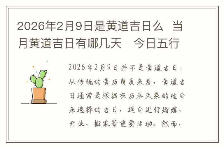 2026年2月9日并不是黄道吉日。从传统的黄历角度来看,黄道吉日通常是根据农历和天象的结合来选择的吉日,适合进行婚嫁、开业、搬家等重要活动。然而,2026年2月9日并未列入黄道吉日之列,建议在此日期安排较小的活动,避免重要事务。