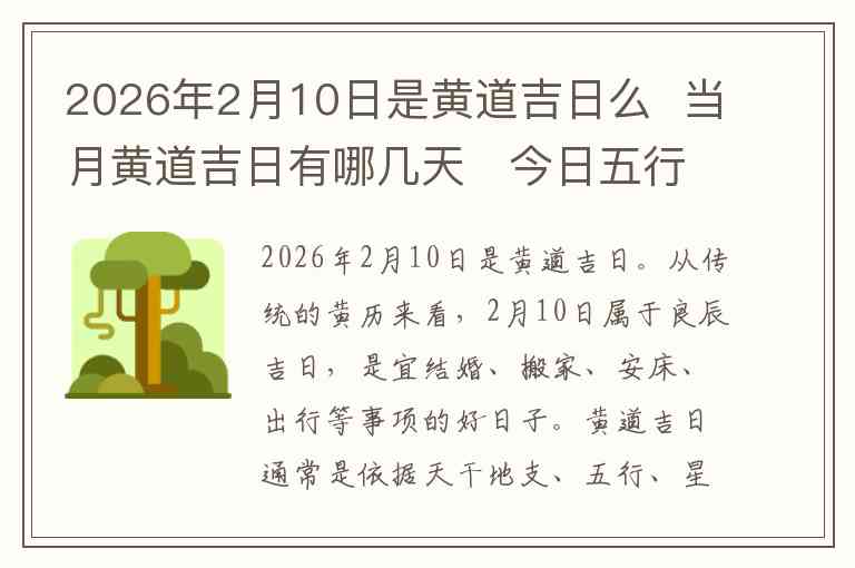 2026年2月10日是黄道吉日。从传统的黄历来看,2月10日属于良辰吉日,是宜结婚、搬家、安床、出行等事项的好日子。黄道吉日通常是依据天干地支、五行、星宿等因素来判断,适合进行一些具有重要意义的活动,以获得良好的运势。