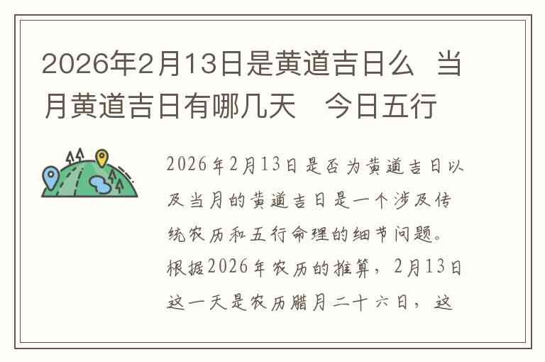 2026年2月13日是否为黄道吉日以及当月的黄道吉日是一个涉及传统农历和五行命理的细节问题。根据2026年农历的推算,2月13日这一天是农历腊月二十六日,这一天并不特别被标记为黄道吉日。因此,它不属于黄道吉日。黄道吉日通常是指那些按照黄历的推算,适合进行婚嫁、开业、安葬等重大活动的日子。