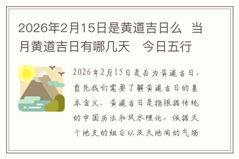2026年2月15日是否为黄道吉日,首先我们需要了解黄道吉日的基本含义。黄道吉日是指根据传统的中国历法和风水理论,依据天干地支的组合以及天地间的气场等因素,选择出的适合进行婚嫁、搬家、开业等活动的吉利日子。每个日期的吉凶与个人的八字、五行等因素密切相关,因此并不是所有人都会在同一天有相同的结果。
