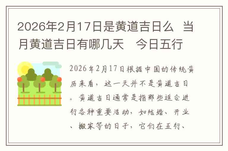 2026年2月17日根据中国的传统黄历来看,这一天并不是黄道吉日。黄道吉日通常是指那些适合进行各种重要活动,如结婚、开业、搬家等的日子,它们在五行、星宿等方面都有特定的吉祥象征。而与之相对的是“黑道日”或“凶日”,这些日子通常被认为不宜进行重大活动。虽然2月17日这一天并不属于黄道吉日,但每个人的命理情况不同,有些人可能会觉得这一天适合某些活动。