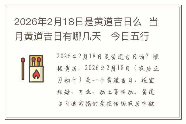 根据黄历,2026年2月18日(农历正月初十)是一个黄道吉日,适宜结婚、开业、动土等活动。黄道吉日通常指的是在传统农历中被认为适合进行某些重要活动的日子,尤其是婚嫁、安葬、开工等。黄道吉日通常根据天干地支、星宿位置和五行相生相克来判断。