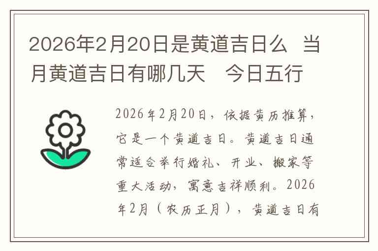 2026年2月20日,依据黄历推算,它是一个黄道吉日。黄道吉日通常适合举行婚礼、开业、搬家等重大活动,寓意吉祥顺利。