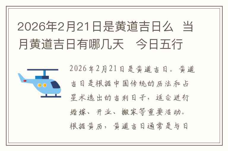 2026年2月21日是黄道吉日。黄道吉日是根据中国传统的历法和占星术选出的吉利日子,适合进行婚嫁、开业、搬家等重要活动。根据黄历,黄道吉日通常是与日主的五行属性、天干地支等因素紧密相关的。
