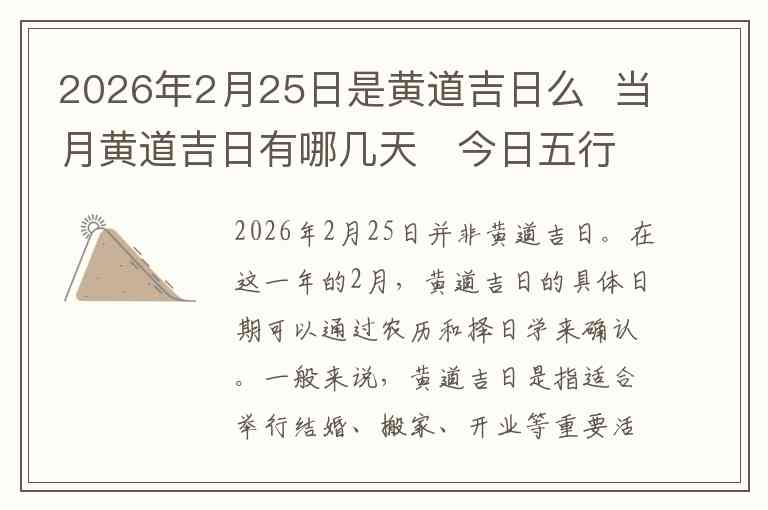2026年2月25日并非黄道吉日。在这一年的2月,黄道吉日的具体日期可以通过农历和择日学来确认。一般来说,黄道吉日是指适合举行结婚、搬家、开业等重要活动的日子,通常会避开“冲煞”和其他不宜的日子。2026年2月的黄道吉日有以下几天: