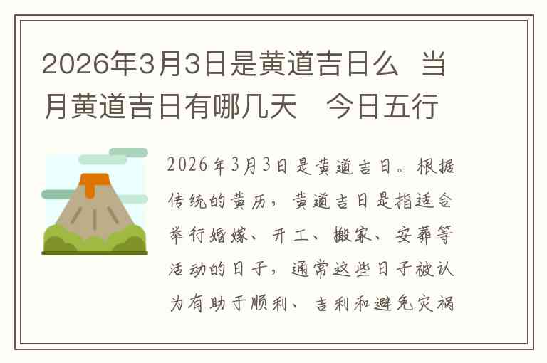 2026年3月3日是黄道吉日。根据传统的黄历,黄道吉日是指适合举行婚嫁、开工、搬家、安葬等活动的日子,通常这些日子被认为有助于顺利、吉利和避免灾祸。在2026年3月的黄道吉日中,3月3日是其中的一天。