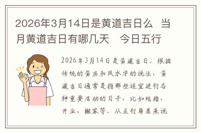 2026年3月14日是黄道吉日。根据传统的黄历和风水学的说法,黄道吉日通常是指那些适宜进行各种重要活动的日子,比如结婚、开业、搬家等。从五行角度来说,黄道吉日的选择通常会结合天干地支的配合、五行的相生相克以及日主的喜忌来判断。