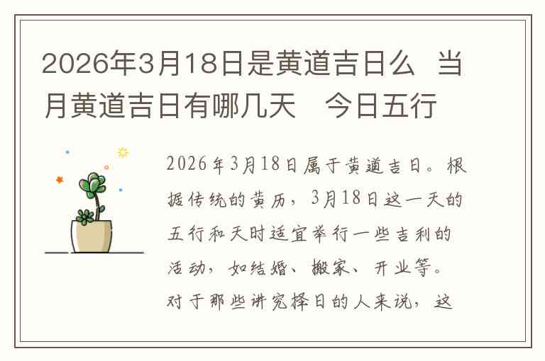 2026年3月18日属于黄道吉日。根据传统的黄历,3月18日这一天的五行和天时适宜举行一些吉利的活动,如结婚、搬家、开业等。对于那些讲究择日的人来说,这一天是一个比较有利的日子。