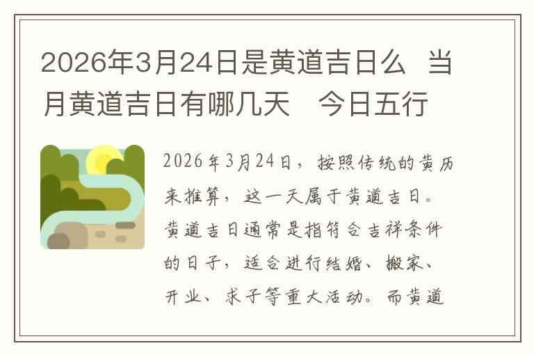 2026年3月24日,按照传统的黄历来推算,这一天属于黄道吉日。黄道吉日通常是指符合吉祥条件的日子,适合进行结婚、搬家、开业、求子等重大活动。而黄道的划分是基于天文学的规律,黄道吉日是依据天干地支、五行、岁次等因素综合判断的。