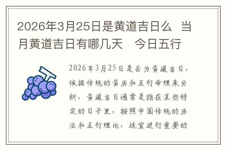 2026年3月25日是否为黄道吉日,依据传统的黄历和五行命理来分析,黄道吉日通常是指在某些特定的日子里,按照中国传统的历法和五行理论,适宜进行重要的活动,比如结婚、搬家、开工、开张等。根据2026年3月的黄历,3月25日为“辛巳”日,这一天是黄道吉日,适合进行一些重要的事务,因此可以认为这是个吉利的日子。