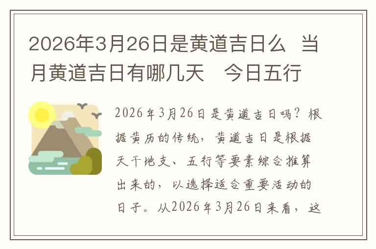 2026年3月26日是黄道吉日吗?根据黄历的传统,黄道吉日是根据天干地支、五行等要素综合推算出来的,以选择适合重要活动的日子。从2026年3月26日来看,这一天确实是一个黄道吉日,适合进行一些重要的活动,比如结婚、开业、搬家等。对于选择黄道吉日的人来说,这一天是一个较为吉利的日子,象征着顺利与繁荣。