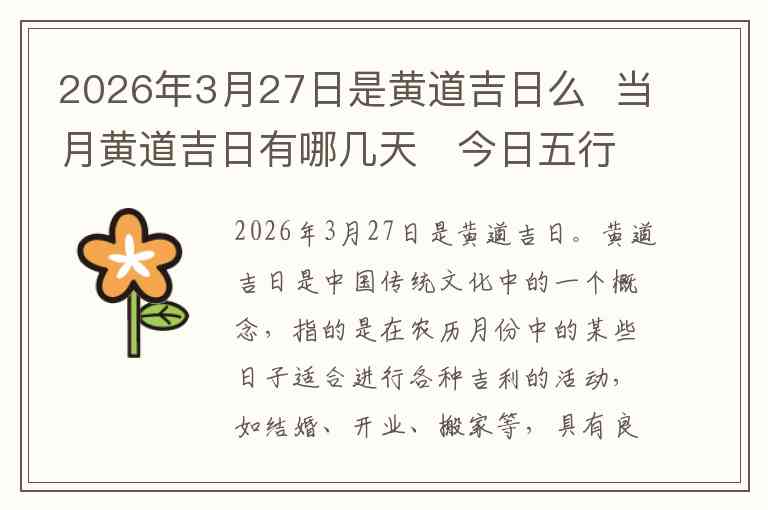 2026年3月27日是黄道吉日。黄道吉日是中国传统文化中的一个概念,指的是在农历月份中的某些日子适合进行各种吉利的活动,如结婚、开业、搬家等,具有良好的运势和能量。