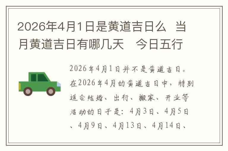 2026年4月1日并不是黄道吉日。在2026年4月的黄道吉日中,特别适合结婚、出行、搬家、开业等活动的日子是:4月3日、4月5日、4月9日、4月13日、4月14日、4月18日、4月21日和4月24日。