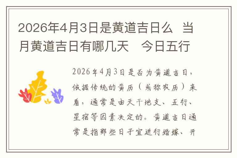 2026年4月3日是否为黄道吉日,依据传统的黄历(或称农历)来看,通常是由天干地支、五行、星宿等因素决定的。黄道吉日通常是指那些日子宜进行婚嫁、开业、搬家、签约等重要活动的日子,它们被认为有利于顺利和吉祥。