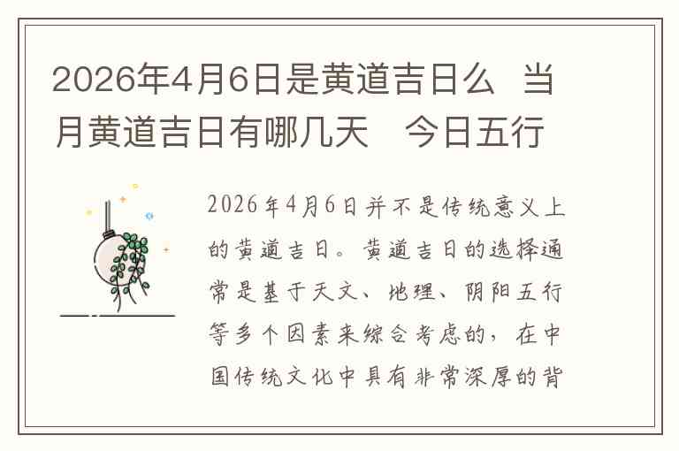2026年4月6日并不是传统意义上的黄道吉日。黄道吉日的选择通常是基于天文、地理、阴阳五行等多个因素来综合考虑的,在中国传统文化中具有非常深厚的背景。黄道吉日通常是指适合进行婚嫁、搬家、开业、动土等重大活动的日子,这些日子在黄历上会有特别标注。
