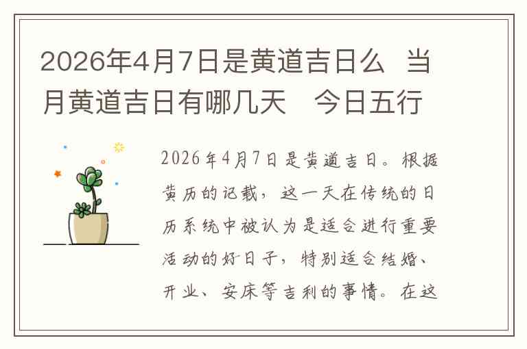 2026年4月7日是黄道吉日。根据黄历的记载,这一天在传统的日历系统中被认为是适合进行重要活动的好日子,特别适合结婚、开业、安床等吉利的事情。在这一天,属兔、属鸡的人会受到较好的吉祥运势。