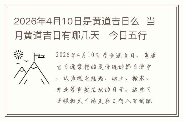 2026年4月10日是黄道吉日。黄道吉日通常指的是传统的择日学中,认为适合结婚、动土、搬家、开业等重要活动的日子。这些日子根据天干地支和五行八字的配合而定。2026年4月10日的黄道吉日适合进行一些有重大意义的事务。