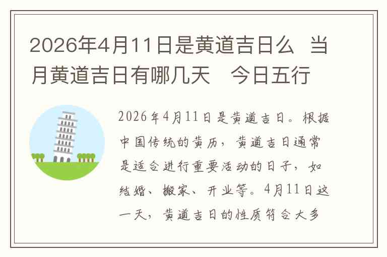 2026年4月11日是黄道吉日。根据中国传统的黄历,黄道吉日通常是适合进行重要活动的日子,如结婚、搬家、开业等。4月11日这一天,黄道吉日的性质符合大多数人的需求,所以是一个有利于举行吉祥活动的日子。