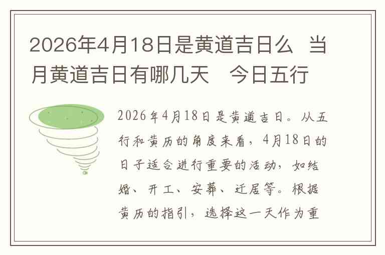 2026年4月18日是黄道吉日。从五行和黄历的角度来看,4月18日的日子适合进行重要的活动,如结婚、开工、安葬、迁居等。根据黄历的指引,选择这一天作为重大事务的吉日,是有助于增运避凶的。根据天干地支与五行的配合,今天是一个适宜动土和开创性活动的日子,整体而言有助于促进事业和生活的顺利发展。